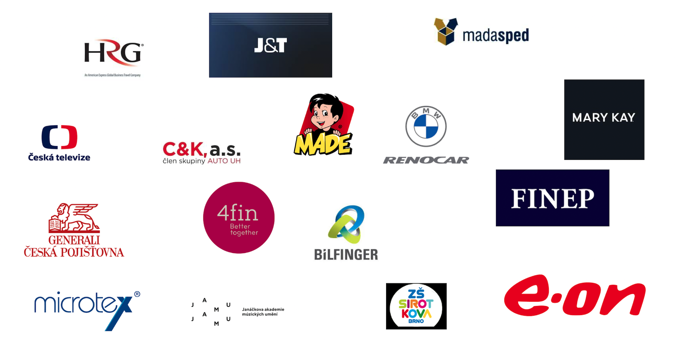 Renocar, J&T, HRG, EON Distribuce, a.s., JAMU, 4fin, C&K a.s., Mary Kay, Česká pojišťovna, microtex a.s., Královopolská strojírna, Finep, Bilfinger, Building s.r.o., Extra nádobí, Made hračky, Madasped, ZŠ Sirotkova Brno, Vysoká škola polytechnická Jihlava, Moravské gymnázium Brno ...